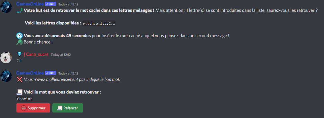 Le bot vous donne une liste de lettres mélangées et y ajoute entre 1 et 4 lettres suivant le niveau de difficulté choisi.