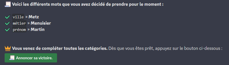 Après chaque envoie, un récapitulatif de la catégorie ainsi que du mot associé est envoyé (Visible uniquement par le joueur).&#x20;