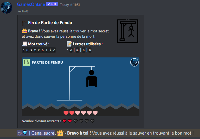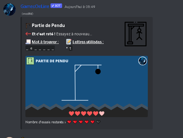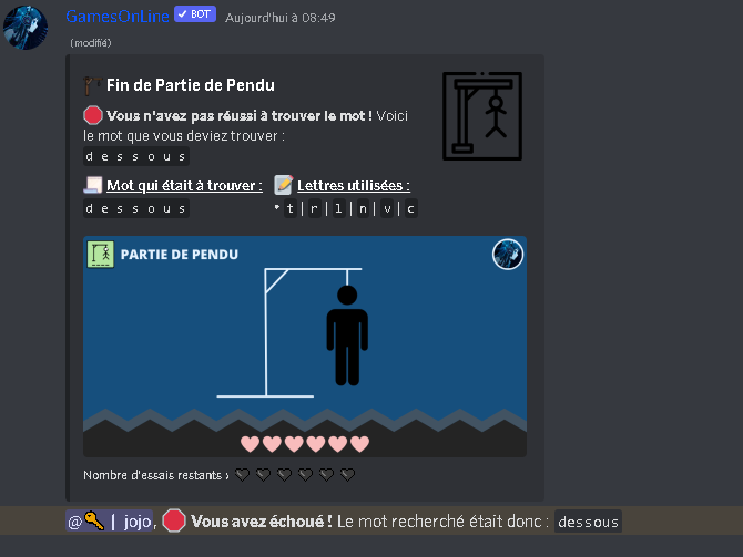 * **Description** : Le Pendu est un jeux où vous devez retrouver le mot caché en donnant des lettres au bot. Mais attention, vous n'avez le droit qu'à 6 erreurs !